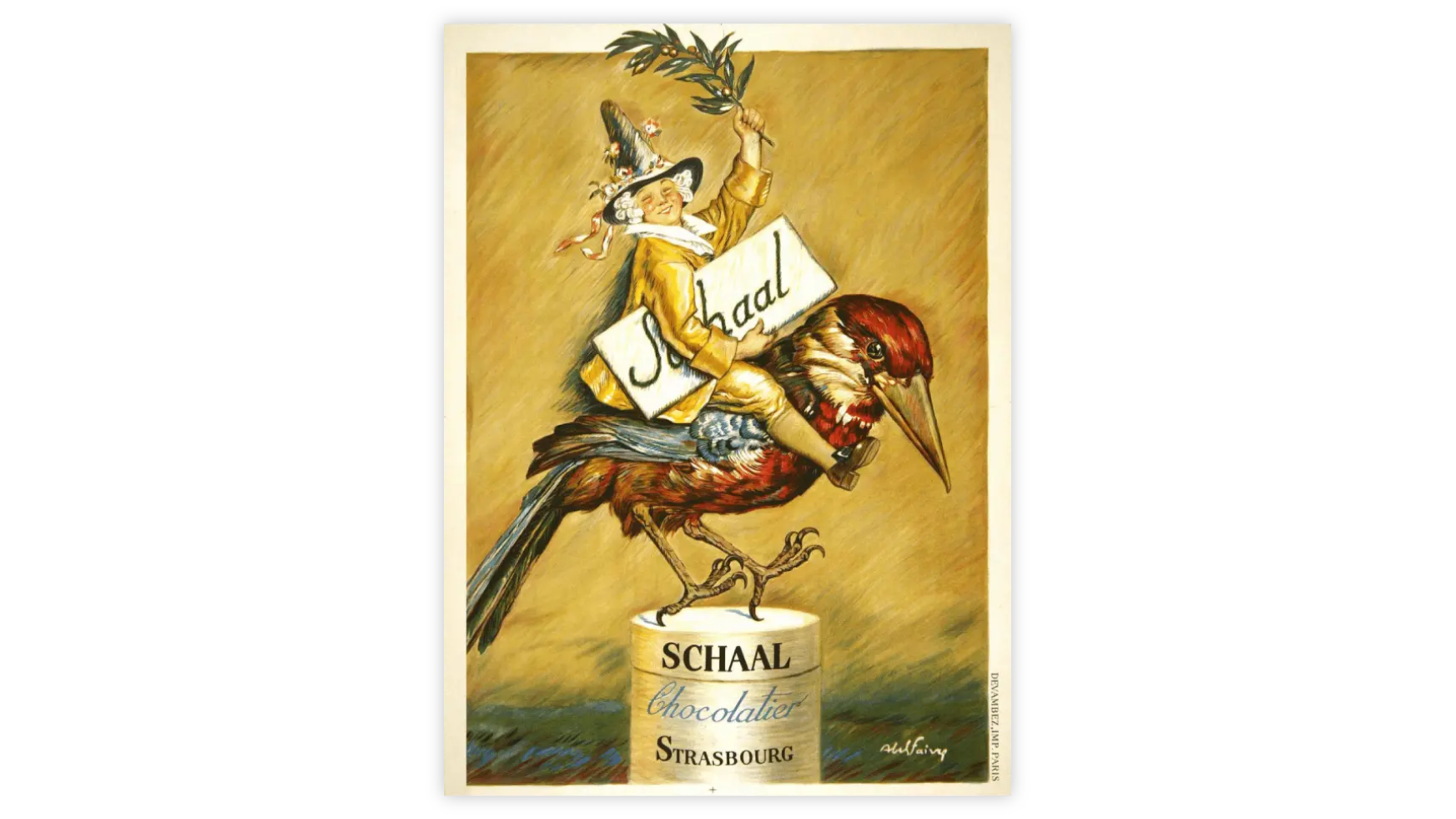 spirit of Schaal Chocolatier. Painted in the early 1920s, it features a whimsical character riding a fantastical bird - joyfully presenting Schaal as a symbol of indulgence and imagination. A true blend of art and chocolate tradition, this historic artwork celebrates Schaal’s legacy as a master chocolatier from Strasbourg, crafting exquisite creations since 1871.
